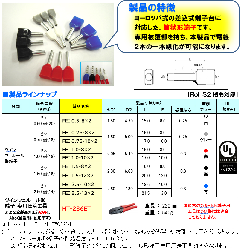 この度、弊社のフェルール形端子ラインナップに「ツインフェルール形端子」を追加いたしましたので、下記にてご案内させて頂きます。